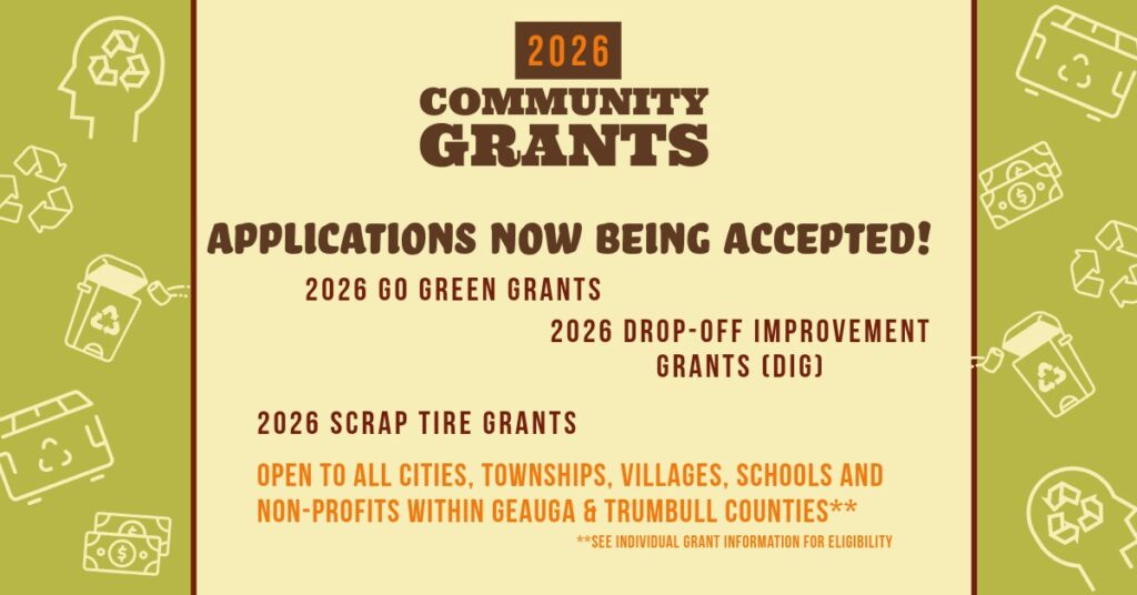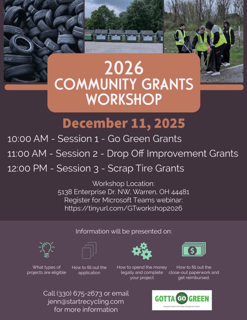 Funding is guaranteed up to the amount budgeted for your community. Scrap Tire Grant applications must be received via email to jenn@startrecycling.com or mail to the District office at 5138 Enterprise Dr., Warren, OH 44481 by Friday, February 27, 2026.