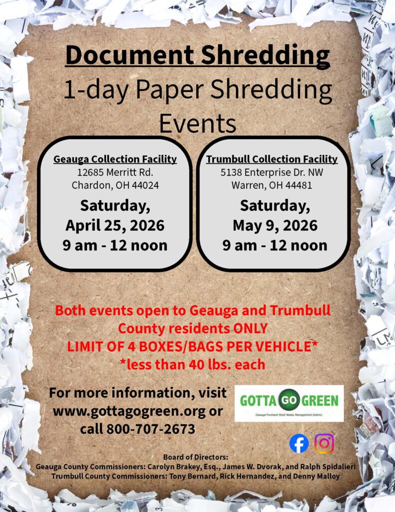 Each year, the District offers FREE paper shredding events at each of our two collection facilities. Paper shredding is an effective way to protect confidential information, such as personal or financial data, from falling into the wrong hands. Shredding sensitive documents can help prevent identity theft, fraud, and other types of financial crimes.